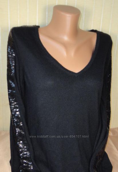 Джемпер женский NextРасширен книзу. Спинка чуть удлинена. По плечам и рукавам декоративная вставка отделанная мелкими паетками. Состав ткани: 61% вискоза + 16% нейлон + 16% хлопок + 7% кашемир.