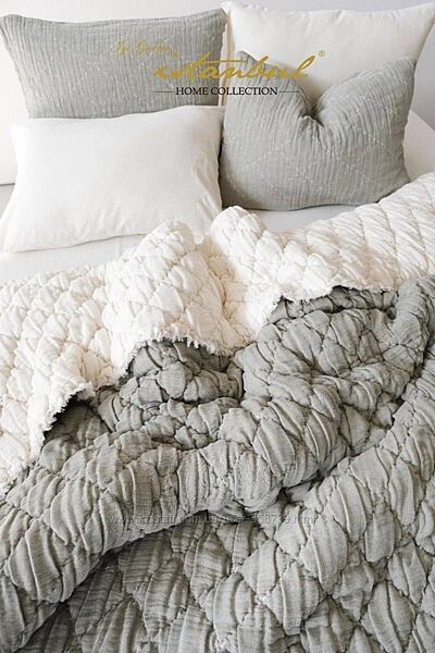 Особенностью данной серии покрывал является их двусторонность – одна цветная сторона другая всегда молочного цвета. В середине имеются тонкий слой наполнителя. Покрывало с наволочками станет изюминкой комнаты, гармонично дополнит любую интерьерную композицию.