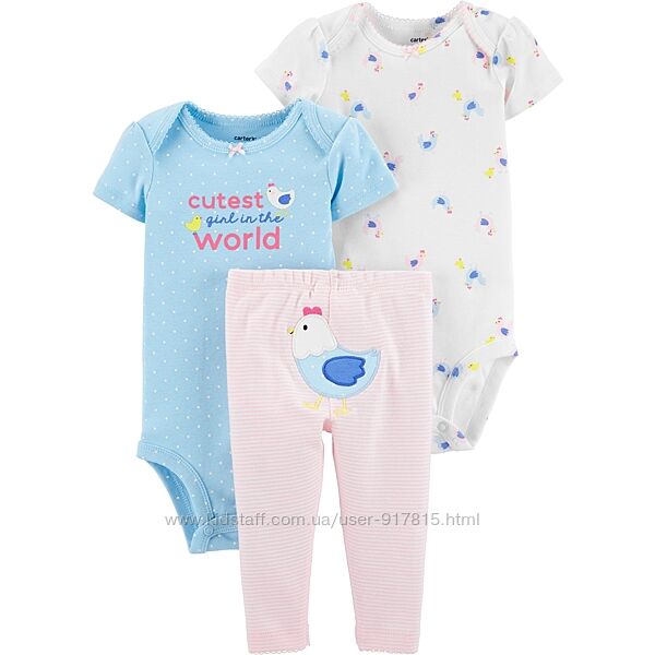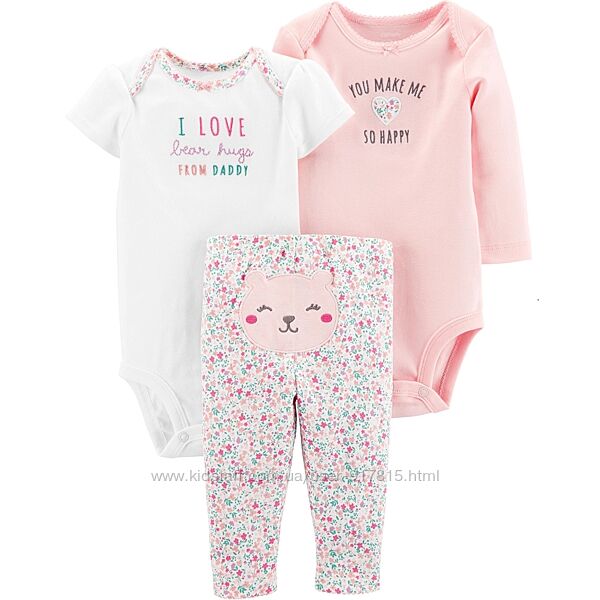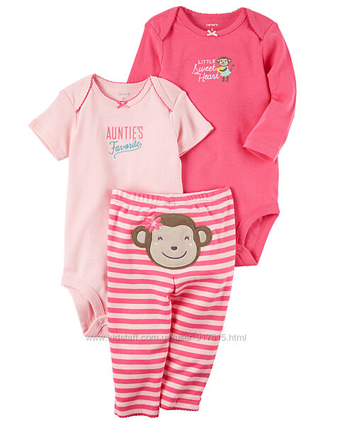 Якісний трикотажний комплект (набір) "Веселі попки" для дівчинки з 3-х предметів популярного американського бренду Carter_s, оригінал.У комплект входить: боді з коротким рукавом - 1шт., боді з довгим рукавом - 1шт., штанці з аплікацією на попі - 1шт.