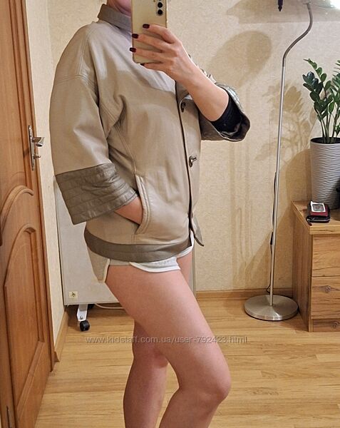 Дуже красива, елегантна, стильна та незвичайна. Купувалася за 450 $ у фірмовому бутику. Якісна, м´яка натуральна шкіра. Стан - як нова, носилася мало, берегла її, а зараз поправилась. За рахунок полуторного рукавчика та такого крою + гарний перламутровий колір виглядає оригінально. Річ дійсно дорога і якісна. Колір як на фото - бежевий з легким перламутром та вставками на рукавах та по низу кольору капучіно. Фірма – Glabor.Розмір вказаний - 40. Підкладка та весь стан - ідеальний. Заміри: довжина від плеча - 62 см, ПОГ - 50 см (можна по необхідності перешити гудзики і зробити ширше), ПОС (ширина по низу) - 48 см, довжина рукава від горла - 52 см, від плеча - 32 см, повна ширина рукава - 40 см