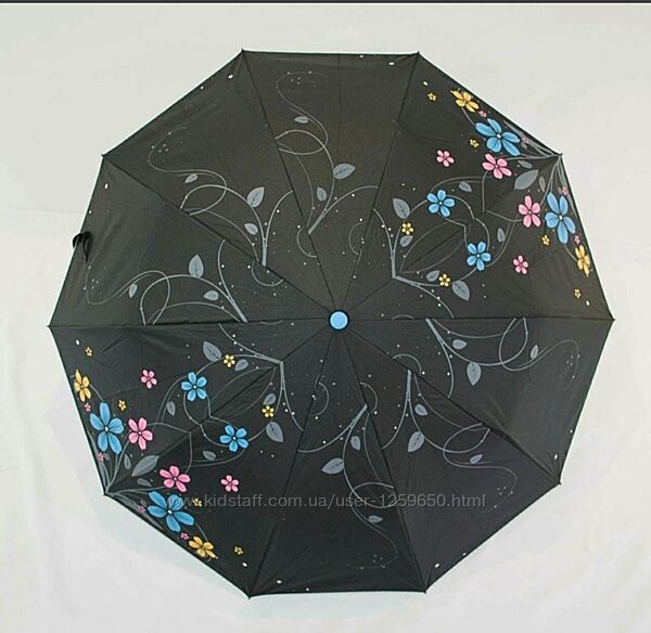 Женский зонт полуавтомат внутри серебряный купол-снаружи черный фон с серебряной окантовкой и рисунки цветы-очень качественные зонты эти.В наличии с голубой ручкойКупол зонта