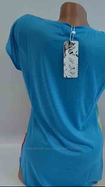 Расцветка комбинированная (голубой и белый). Размер 48-50. Стильный фасон. Перёд футболки короче чем зад. Состав: 65 % хлопок, 35 % полиестр. Длина спереди 63 см, сзади 77 см, ширина в груди 51 см, ширина в бедрах 52 см. Доставка Новой почтой, Укрпочтой.