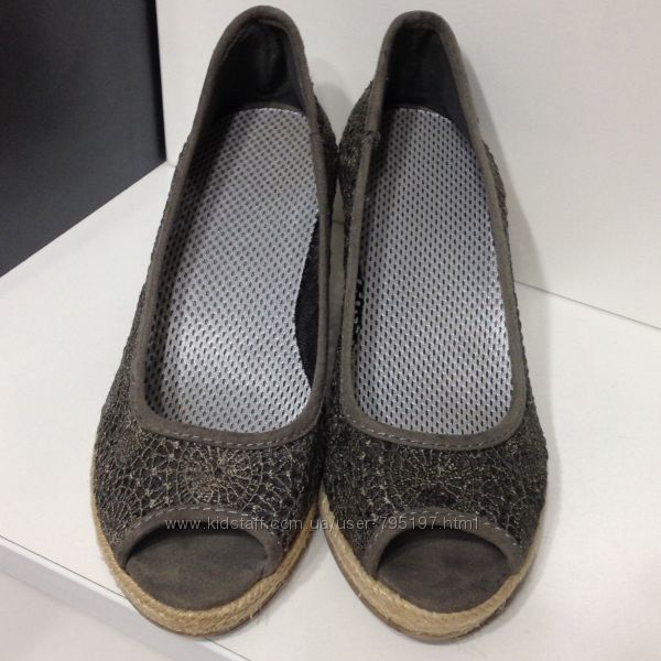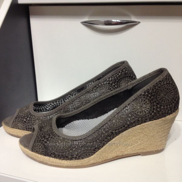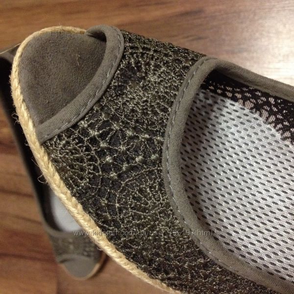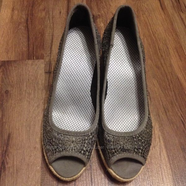 Описание лота: Женские босоножки в отличном состоянии,без дефектов и следов носки!Производитель Германия,верх ажурный текстиль-очень качественный не разлезется!Размар указан 39,стелька 25,5см,подошва 23см,высота танкетки спереди 1,5см,сзади 7,5см.Следом носки могу назвать -отклеилась одна стелька,но как видите проблема устранена.Состояние как новые!Цвет серый,но чуть с оттенком хаки.Способы доставки: Нова Пошта и тп)