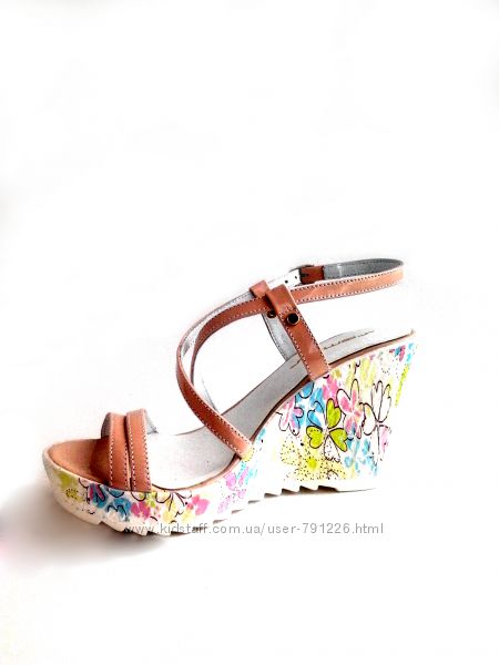 Босоножки в двух цветовых вариантах, верх с натуральной лаковой кожи, на танкетке - платформе, танкетка с цветочным принтом на белом фоне и на амарантово - розовом фоне, ремешки на регулируемых позолоченных пряжках. Подошва на модном профилируемом рифлении. Босоножки очень легинькие.