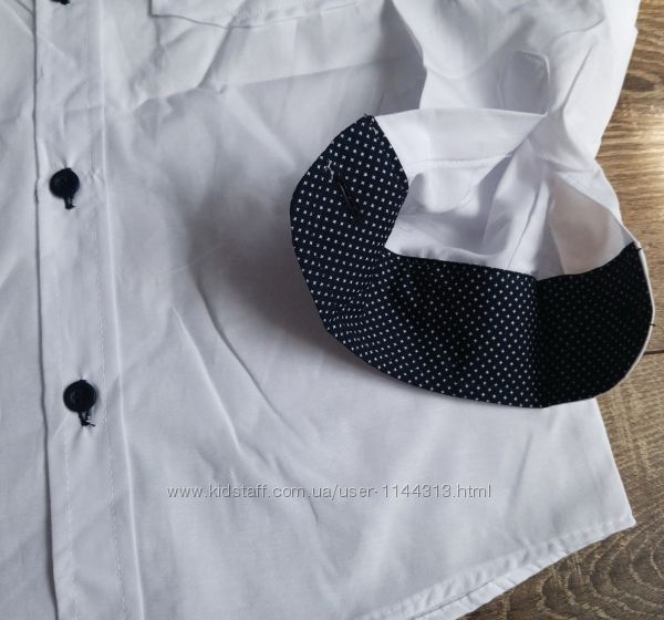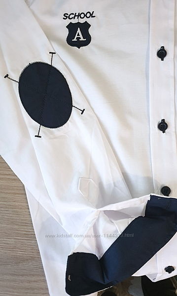 Рубашка белая на мальчика. Локти, внутренняя часть воротника и манжета отделана темно-синей тканью (в белую точечку или однотонная темно-синяя ткань в зависимости от завоза). Подходит для школы. Производитель Турция.Размер 7