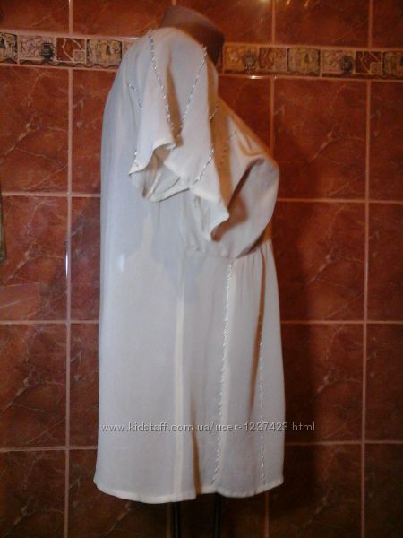 Нежнейшая блузка из шиифона в комбинации нат. шелком.Рукава и перед обшиты бисером.Цвет телесный.Невесомая.На спинке у шеи и под грудью драпировка.Перед отрезной.Вырез уголком.Рукав реглан крылышшко.Новая.Все бусины на месте.В реале очень красиво Состав:вискоза 83 шелк17 Размер 46-48 длина 60 ПО грудь 50 бедра 58 от горловины рукав 29