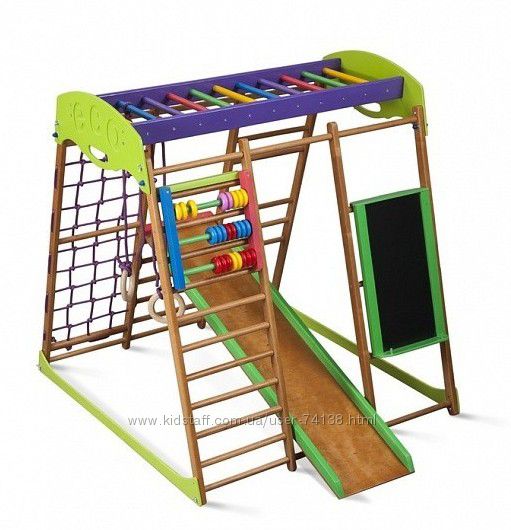 Детский спортивный комплекс для квартиры «Карамелька виолет»Положительно влияет на развитие ребёнка, формирует навыки счёта, письма, укрепляет мускулатуру.Детский спортивный комплекс для квартиры. В наборе игровые элементы: мольберт, счеты, лесенки, кольца, горочка.