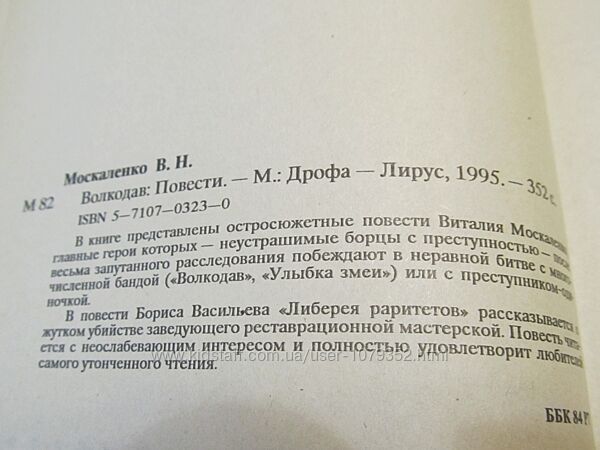 В книге представлены повести Виталия Москаленко: - "ВОЛКОДАВ" - "УЛЫБКА ЗМЕИ" - "ЛИБЕРЕЯ РАРИТЕТОВ" повесть Бориса Васильева Издательство: М.:Дрофа-Лирус, 1995.-352 с. Твердый переплет. Глянцевая суперобложка. Домашняя библиотека. Язык: русский Состояние: отличное Товар обмену и возврату не подлежит! Доставка: Новой почтой после оплаты Смотрите все объявления!