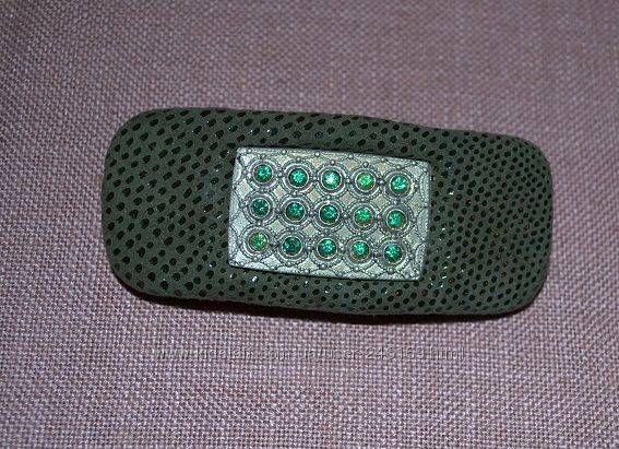 - Фото 5-6 Заколка-автомат из натуральной кожи болотного цвета с лазерной шлифовкой.Вставка-винтажная старая брошь.Идеально подойдёт брюнеткам,девушкам с каштановыми или рыжими волосами или как дополнение к одежде подобного цвета.