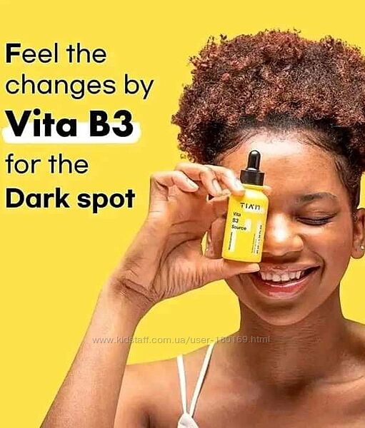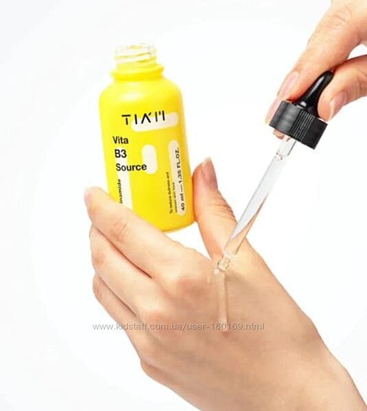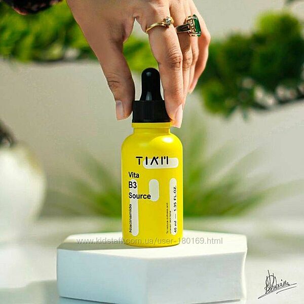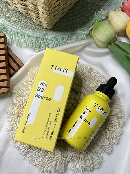 Висококонцентрована сироватка для ефекту сяяння шкіри TIAM Vita B3 Source , збагачена потужними відбілюючими компонентами (ніацинамід і арбутин), направлено працюють на зниження вироблення меланіну, що сприяє зменшенню почервоніння і пігментних плям, відмінно вирівнює тон обличчя. Засіб сприяє посиленню синтезу власного колагену, підвищуючи еластичність і пружність шкіри, розгладжує і упереджує появі зморшок. Висока ефективність засобу обумовлена додаванням ніацинаміда (10%) і арбутину (2%).