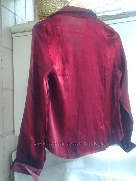 Блузка в отличнейшем состоянии, дефектов и недостатков нет, ткань переливается, фото немного отсвечивает, 44 размер.Состав полиэстр, выполненный под атлас, красиво.