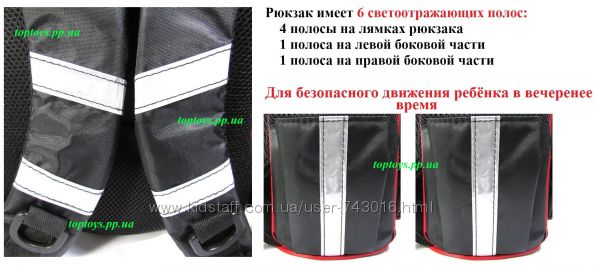 - Рюкзак имеет 6 светоотражающих полос . Для безопасного движения ребёнка в вечернее время.