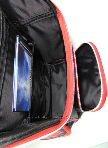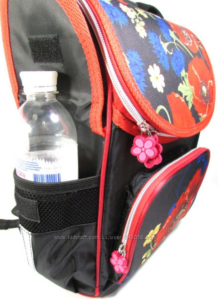 - 2 наружных боковых кармана на резинках из материала типа "сеточка". Сверху каждый карман закрывается клапаном на "липучке". В боковом кармане помещается бутылочка для воды 0,5л