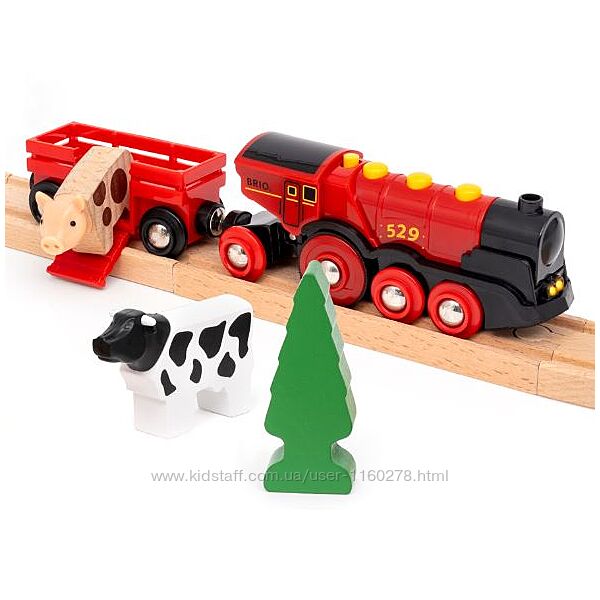 Вперед на свіже повітря! З цим набором Ваша дитина відправиться у захоплюючу поїздку до сільської місцевості, щоб подивитися на тварин та насолодитися чудовим краєвидом.До складу набору входить залізничне полотно, дерево, переїзд, огорожа, фігурки корови та свині, паровоз з вагоном для перевезення худоби. У вагон можна садити тварин. Паровоз може рухатися вперед та назад. Працює від батарейок 2 х ААА (купуються окремо). При русі вперед світяться передні фари, при переміщенні назад горить червона лампа позаду. За допомогою перемикача колеса можуть бути розблоковані