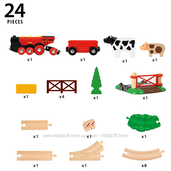 Набір складається з 24 елементів, його можна доукомплектовувати рейками та рухомим складом.