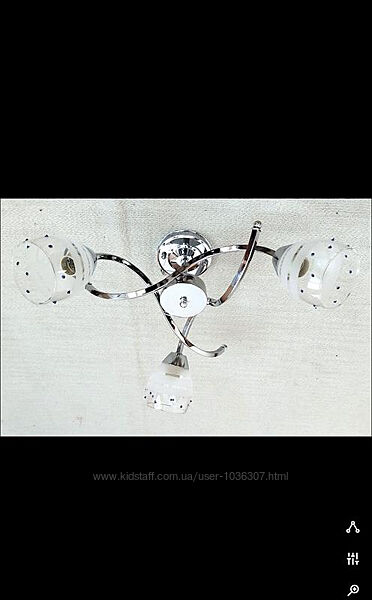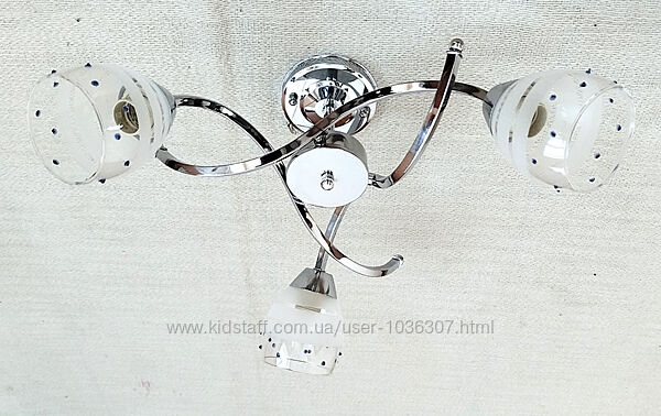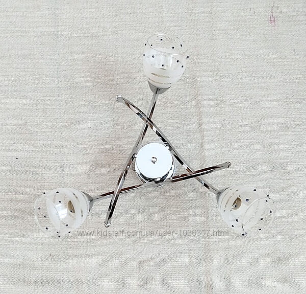 Люстра на 3 плафона Материал корпуса - металл Материал плафонов - стекло Цвет корпуса - серебро Тип патрона - E27 Количество ламп - 6 Диаметр - 55 см Высота -15 см --- Пересылаю компаниями Новая почта, Укрпочта, Мист