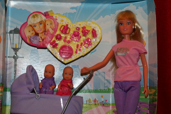 Куколка очень красивая, наборчик имеет презентабельный вид, большой. Кукла Штеффи устроилась на работу няней, ее подопечные — это два милых пупса-близнеца. Штеффи очень любит с ними гулять. Одного она сажает в коляску, а другого в переноску. Если Шеффи устает, то она может повезти сразу двух пупсиков в коляске. В комплекте также имеются различные аксессуары для пупсиков в виде сосок, погремушек, бутылочек и тарелочек. Игрушки изготовлены из качественного материала. 32 п/11