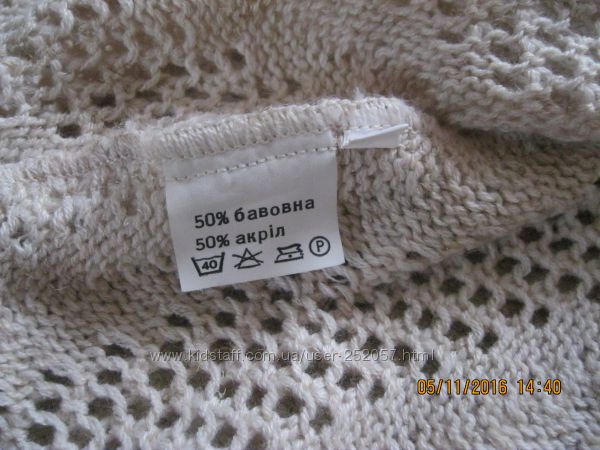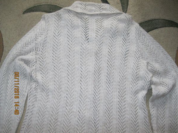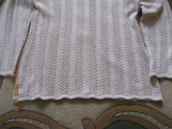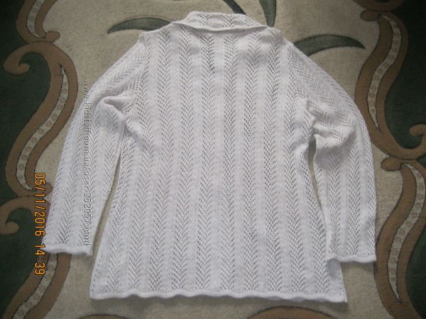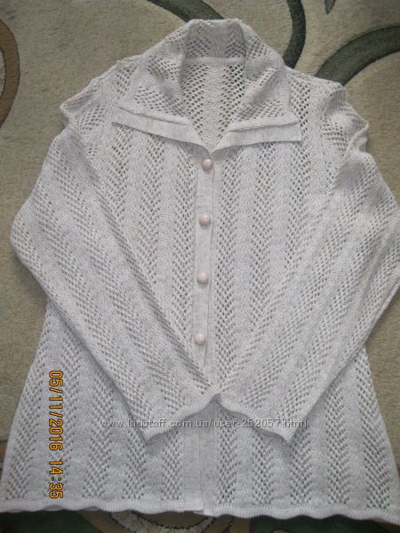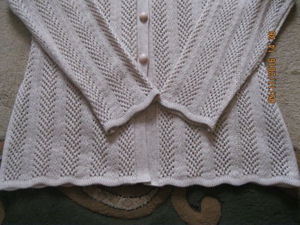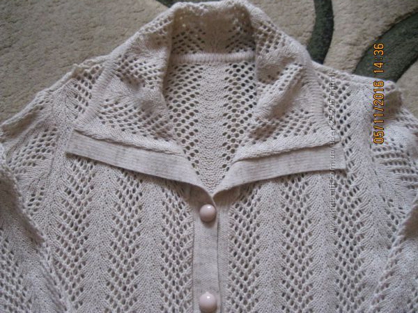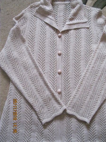 Цвет- бежевый Замеры: длина от плеча - 76 см, ширина под рукавами - 56 см, ширина внизу - 64 см ПОТ - 51 см, рукав- 69см, плечи - 44 см. Кофточка очень хорошо тянется.