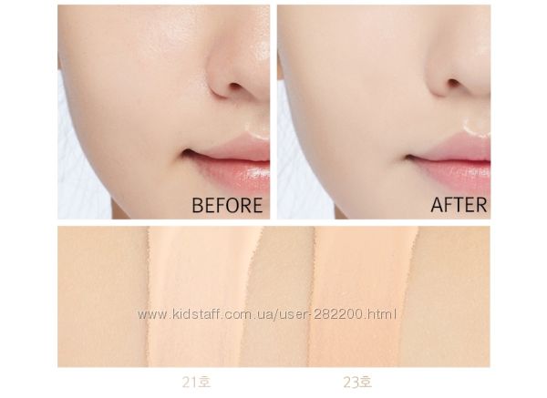 Бездоганно маскують недоліки тону та текстури шкіри, не створює ефекту маски на обличчі. Зручний у використанні завдяки формату cushion - використання спонжу та м´якої подушки, просоченої тональним засобом, забезпечує рівне, природне нанесення на шкіру.