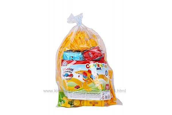 В наборі 44 елементи, серед яких траси з перехрестями та поворотами, спуски, дорожні знаки та 2 машинки. Будівельні цеглини великі та зручні для маленьких діточок.