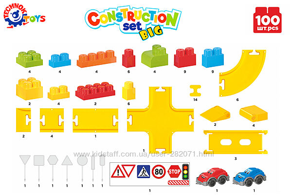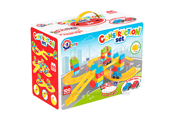 В наборі 100 різноманітних елементів, серед яких траси з перехрестями та поворотами, спуски, дорожні знаки та машинки. Будівельні цеглини великі та зручні для маленьких діточок. З них можна збудувати різноманітні фігури: гаражі, паркінги, будиночки, кораблі чи фігури тваринок.