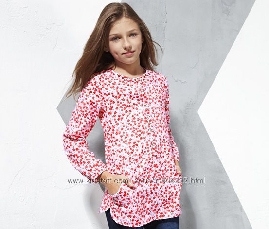 Туника для девочки Sunny Days от Tchibo Германия из мягкого и качественного хлопка, красивый цветочный принт. Размер 158-164. Застежка на кнопочках. Имеет два кармана по бокам. Манжеты на резинке. Материал: 100% хлопок, стирка: 40 °. Новая, этикетка внутри перерезана.