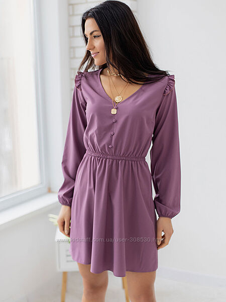 Производитель женской одежды Vikamoda подготовил новинки в трендовой стилистике. Легкое и летящее платье исполнено из высококачественного однотонного софта в трендовой цветовой гамме. Платье полуприлегающего силуэта, длины мини, отрезное по лини талии, с рюшей по плечу. Горловина изделия v-образная, рукава длинные. Рукава объемные на резинке по низу. Резинка на линии талии подчеркивает женственный силуэт. Изюминкой модели являются декоративные пуговицы по полочке изделия. В таком образе каждая девушка почувствует себя максимально комфортно и непринужденно. Надевайте это платье з разнообразными вариантами обуви, аксессуаров и создавайте самые разнообразные модные луки.