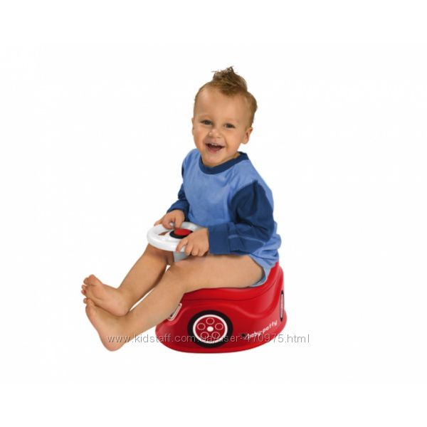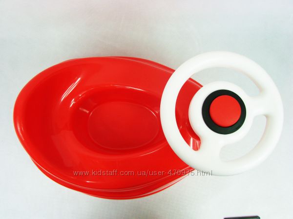 Ярко красный детcкий горшок в дизайне детского автомобиля-каталки, включающий игровую функцию в виде руля с клаксоном, предназначен для постепенного обучения ребенка навыкам самостоятельной гигиены.