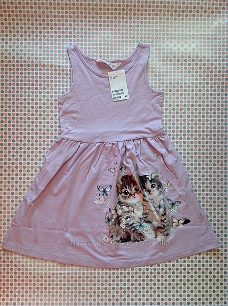 Продам красивый сарафанчик на девочку H&M в нежном лиловом цвете на 4-6 лет (110-116 см) с милым принтом котиков. Состав:100% cotton. Заказываю в Германии.Замеры 4-6 лет: длина от плеча до низа 52 см, грудь 28 см, талия 30 см (в нерастянутом состоянии).