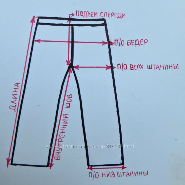 п\обх. бедер - 56см. (середина подъема спереди) , п/о верх штанины - 35см., дл. внутр. шва - 79см., длина штанов - 105см. , подъем спереди - 33см. , подъем сзади - 44см.