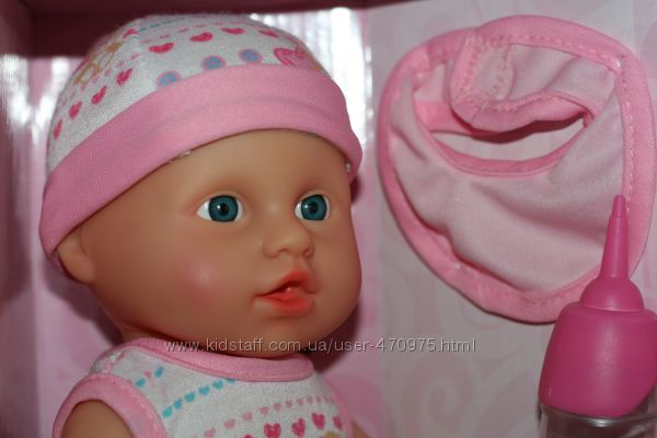Пупсик одет в бодик без рукавов и на липучке снизу, на голове у него шапочка в тон бодику, а также у него есть слюнявчик и пустышка. Пупс пьет из бутылочки и писает в горшочек. нро290