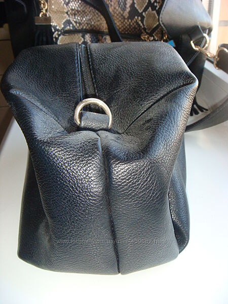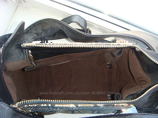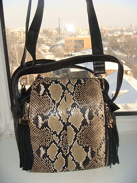 Новая сумка , кожа или кожзам - не могу понять , поэтому утверждать не буду... Черная+вставка под кожу змеи Внутри 1 большое отделение+1 карман на молнии +во внутрь ставится большая косметичка в виде бочонка на молнии 9 на фото она отдельно и внутри показана) . Снаружи 1 карман на молнии сзади, 2 коротких ручки и 1 длинная через плечо ( отстегивается) длина - 26 см ширина - 20 см высота - 28 см ручки длинной от места крепления до места крепения- 50 см. Отправлю в любой город только Новой Почтой или УП - за доставку оплатите при получении.