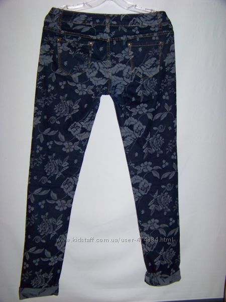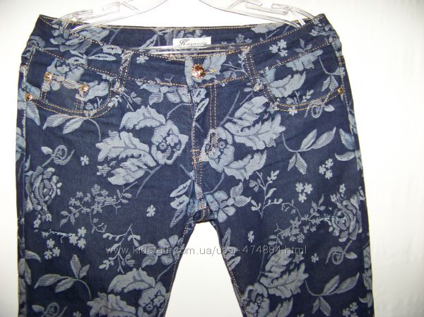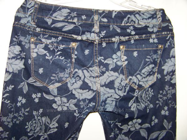 Новые (один раз одетые) джинсы... синие с белыми цветами... драные чуть чуть еле заметно... снизу подвернутые... украшены пуговками в виде цветов... размер 29...