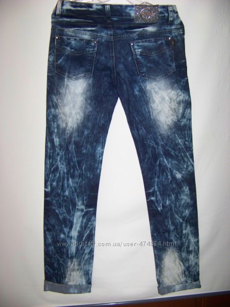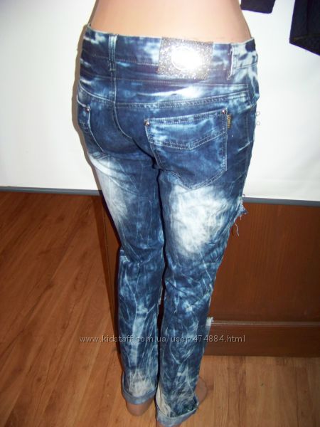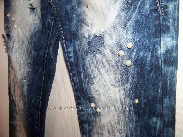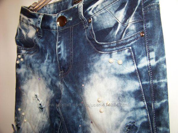 1. Пятнистые сине-белые рваные джинсы со стразами и жемчугом LONGLI JEANSНовые (один раз одетые) джинсы... синие с белыми пятнами-облаками (варенки)... драные остромодные... украшены стразами и белым жемчугом... снизу подвернуты... размер 30...Замеры по ткани: