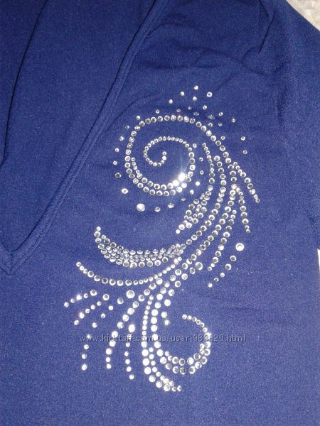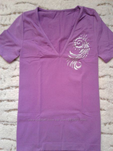 Футболка с коротким рукавом и треугольным вырезом. Стразы - камешки. Ткань очень эластичная, не светится.