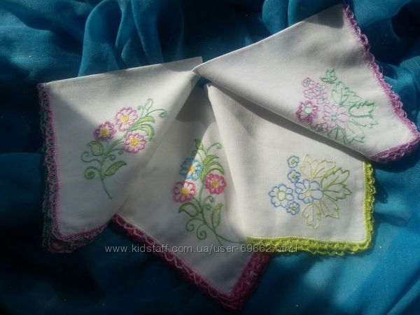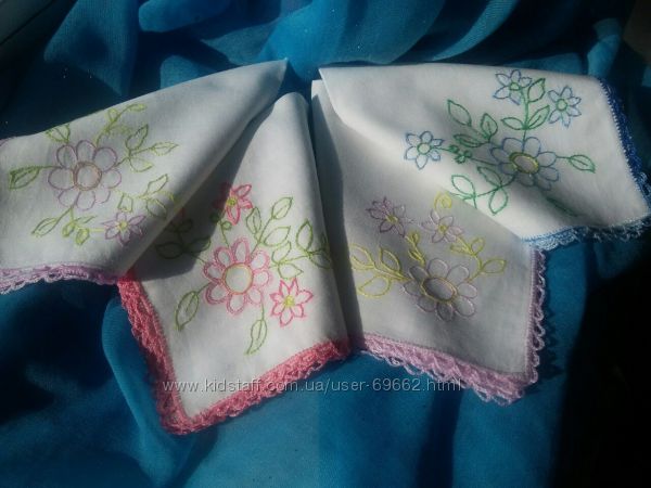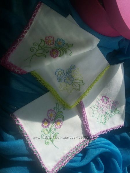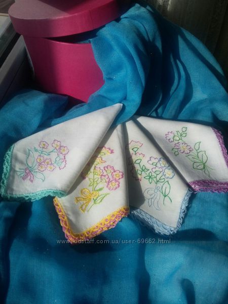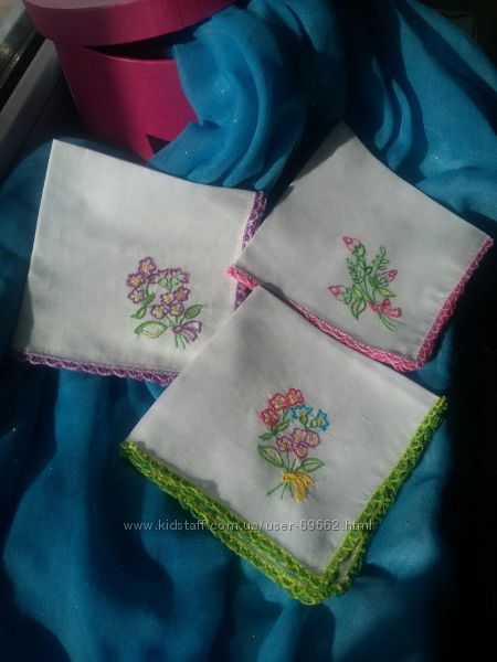 Изысканные носовые платочки ручной работыТкань батист, платочек по краю тонко и красиво обвязан, в углу вышит цветок