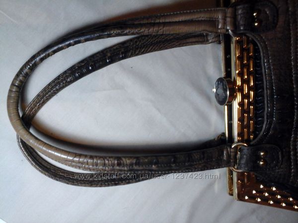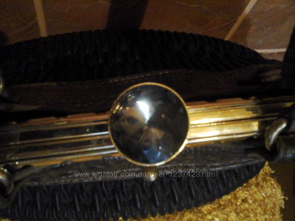 Нарядня польская сумочка Lovica.На удлиненных ручках.Форма трапеция.Застежка защелка в виде камня на металлическом каркасе под золото.Цвет комбинированый.Верх темно коричневый тесненный под рептилию жесткий.Низ черный жатый, мягкий. Высота ручек 25 ширина застежки-каркаса в верху 25 в низу 33. Длина по дну 38.Растягивается. Новая.Дефектов нет