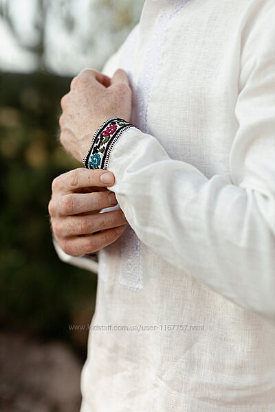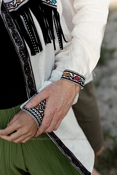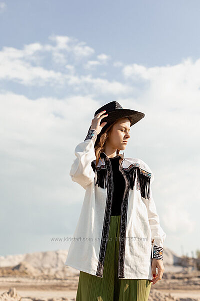 Напівприлеглий силует.Натуральна лляна тканина, акуратна вишивка гляддю, якісна дерев′яна фурнітура.