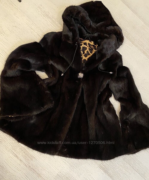 Очень красивая модель, расклешенный рукав, по спинке собрана кулиска на резинке, капюшон полностью из меха.