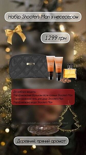 Набір упакований в стильний несесор. Склад набору: 1. Парфумована вода -100 мл 2. Парфумований гель для душу 100 мл 3. Парфумований бальзам після гоління 100 мл 4. Несесер