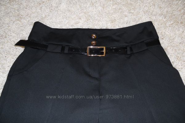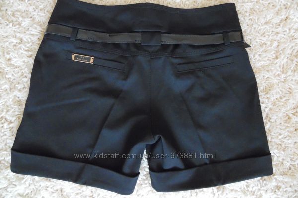 чорні стильні шорти із закотом.До шортів іде пояс.Розмір вказано 46,але йдуть на 44.Ширина у поясі 40см, бедра по рівні кишень 46см, довжина 34см, шагова 13см, ширина штанини внизу 25см.Стан нових,одягала 1 раз. Тканина плотна,не літні,але і не шерсть.