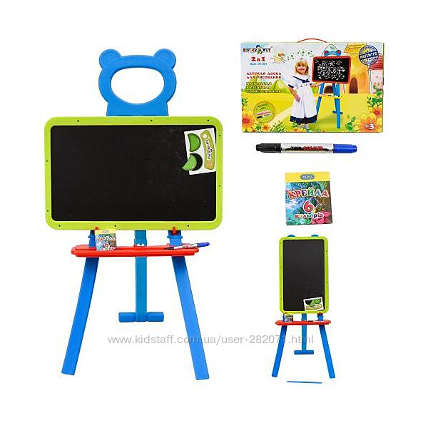 Двусторонняя магнитная доска позволяет рисовать с одной стороны маркером, а с другой стороны мелом. Напольный, разборный, регулируемый по высоте мольберт.