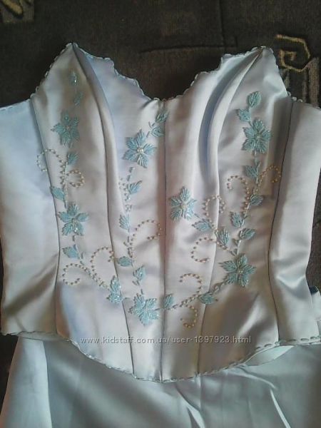 Блакитна випускна сукня. Роздільна - корсет і спідниця.Розм. наш 42-44, євро 34-36. Можна одягати як з кругами, так і без. Корсет регулюється шнурівкою, декорований бісером, ручна робота. Дуже плотний атлас. Є маленький дефект В самісінькому низу спідниці, на краю плямка, яку не помітно. Можна вивести спец. засобами. Стан на 5. Раз одягалась. При потребі зроблю додаткові фото.Дивіться інші мої оголошення))