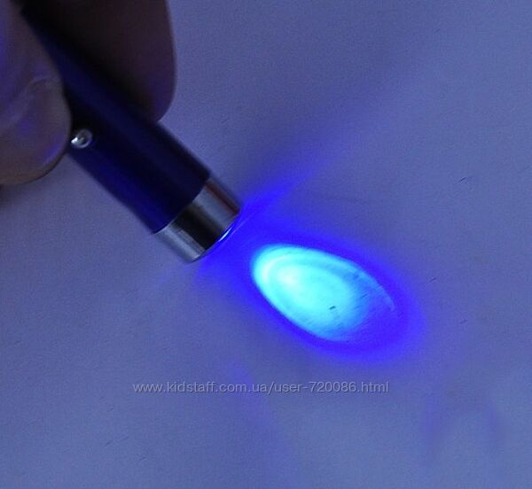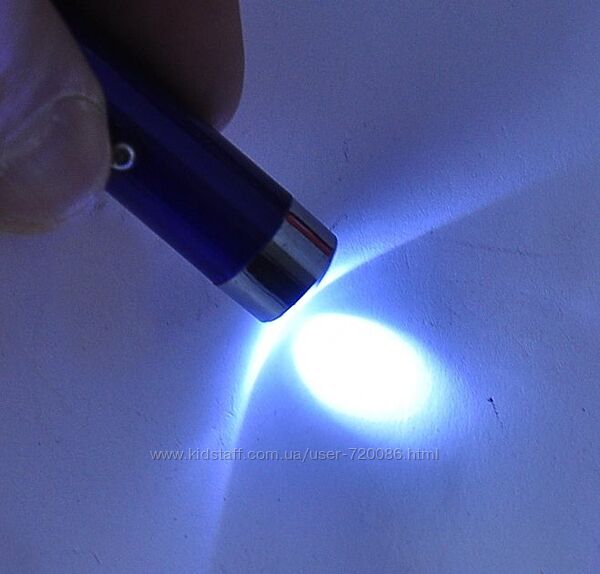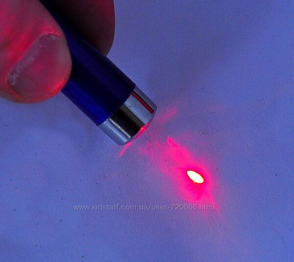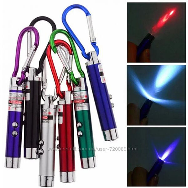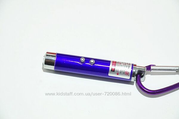 Брелок имеет лазер-красный луч, фонарик- яркий белый светодиод и ультрафиолетовый светодиод. Лазер и фонарик