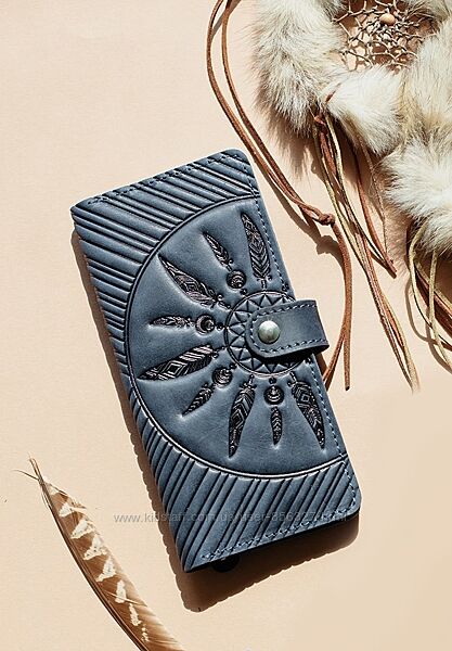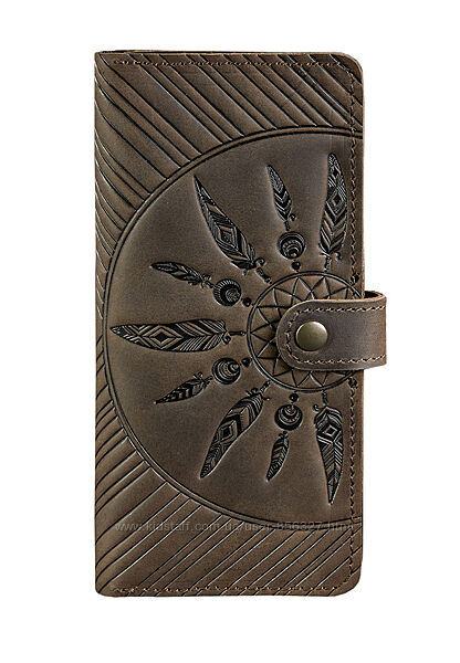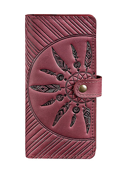 Портмоне «Інді» підкуповує оригінальним дизайном, високою якістю та функціональністю. Оригінальне тиснення у вигляді ловця снів не тільки виглядає відмінно, але й захистить Ваші гроші від швидкого витрачання та необдуманих витрат. Тиснення виконано чітко та акуратно. Вам сподобається тримати портмоне у руках! А темні та насичені кольори додають аксесуару нотку шляхетності та вишуканості.