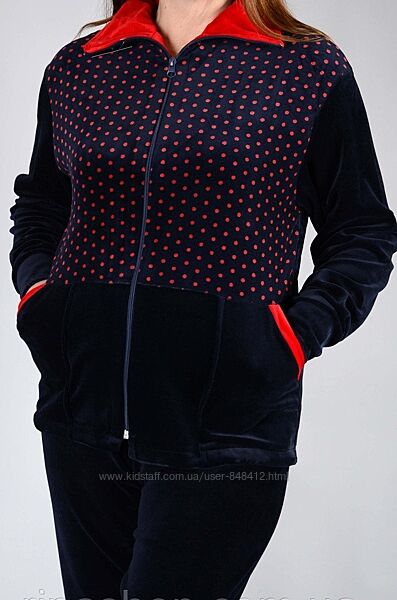 тёмно- синий велюровый костюм в красный горошек и с красным воротником