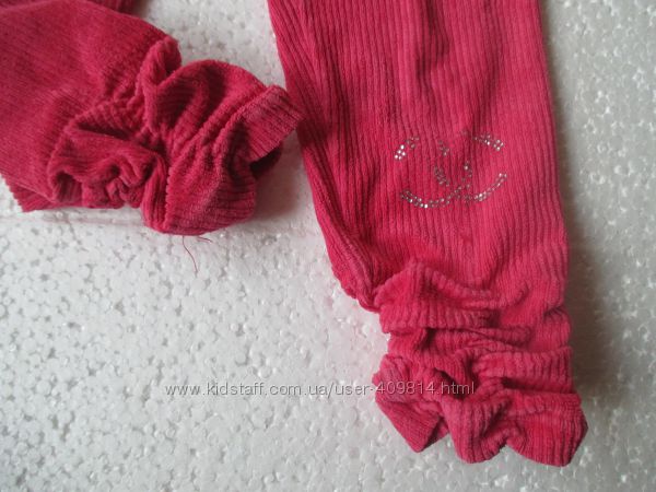 Стильні леггінси-лосини вельветові, призібрані внизу, декоровані камінцями. На бірці - 4 р., можна носити з 3-ох. В хорошому стані. Відпали к-ка камінців, на фото 2 видно, все інше - ок. Заміри - за вимогою.Товар не підлягає поверненню.