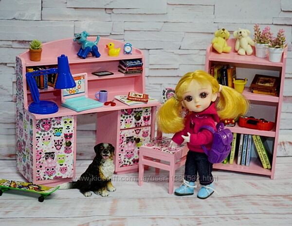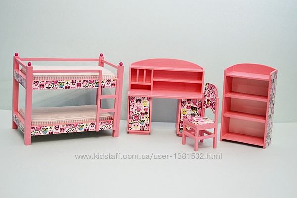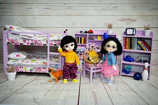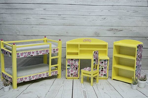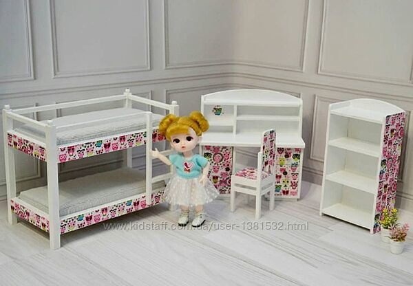 Ручна робота Набір меблів для лялькової дитячої : двоповерхове ліжко з матрасами 20см, письмовий столик, стільчик, шафка для іграшок Підійде для ляльки ростом до 20см ростом Матеріал - дерево, фарба та лак на водній основі Колір по бажанню На замовлення Всі предмети можна замовити окремо