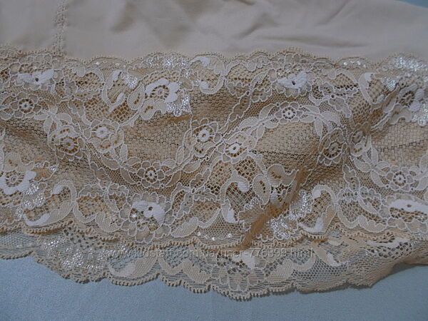 Платье новое, с картонной биркой. Трикотаж тонкий (190 грамм), очень эластичный, бежевого цвета, нить с лоском. Чашки с косточками, бретели регулируются, по низу кружево.Состав: 85% полиамид, 15% эластан