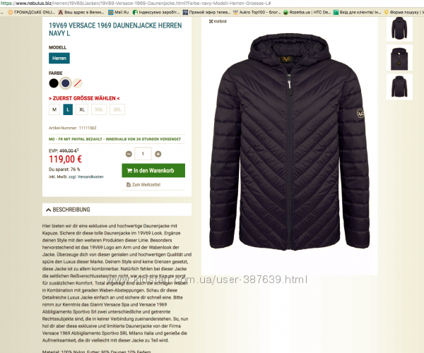 Материал: 100% нейлон, Подкладка: 90% пух 10% перья
